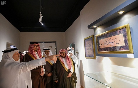 واطلع سموه على مركز الخط العربي والمعرض الفني المصاحب الذي أقيم بمجمع دار القلم التعليمي، كما شاهد عرضاً مرئياً عن المرحلة الأولى للمركز, وتسلم سموه تقريراً عن مركز الخط العربي وهدية تذكارية عبارة عن لوحة من إنتاجات مركز الخط العربي من مدير عام التعليم .